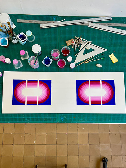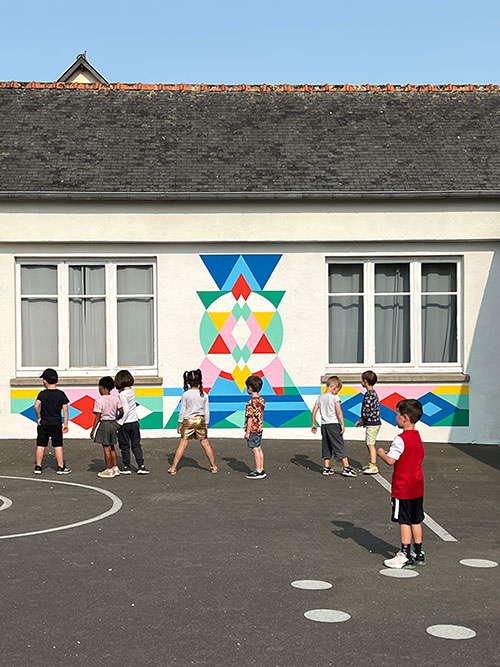 Dans un second temps elle a réalisé un prototype de livre – un grand leporello de 510 x 15 cm qui mêle des dessins abstraits en noir et blanc des enfants et son travail sur les formes et les couleurs – ainsi qu’une peinture murale pour la cour qui reprend la palette et les motifs du livre.